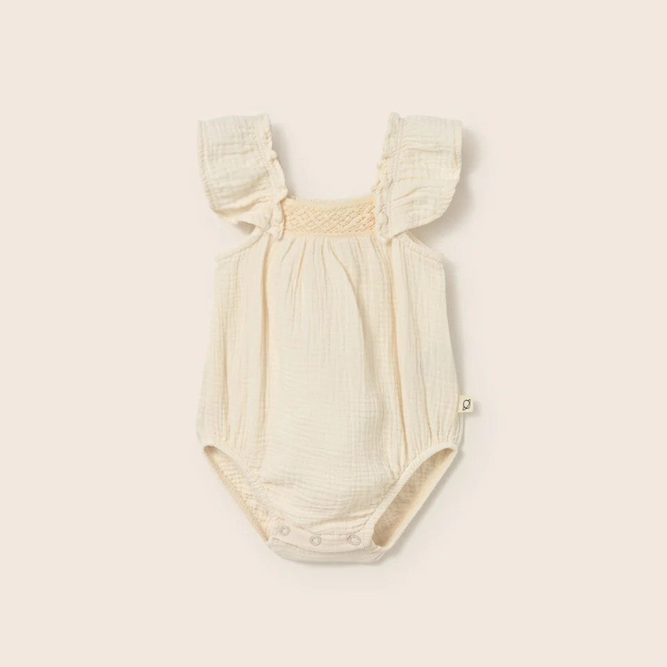 La barboteuse bébé gaze coton TESS Ivory de Cozmo apporte une touche délicate et élégante au dressing des tout-petits. Sa matière légère et respirante assure un confort optimal tout au long de la journée.