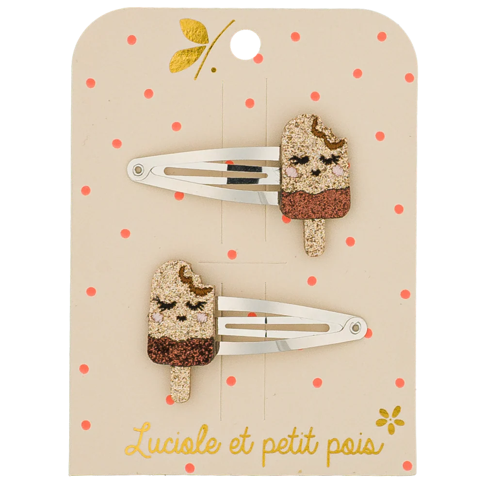 Les barrettes glace au chocolat Luciole et Petit Pois sont parfaites pour ajouter une touche gourmande aux coiffures. Avec leur motif chocolat pailleté, elles font sourire et séduisent les petits gourmands. Un duo sucré et pétillant pour illuminer les cheveux.