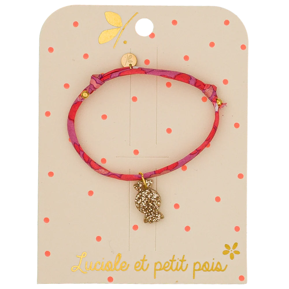 Le bracelet enfant Candy Kiss Luciole et Petit Pois est un accessoire adorable et gourmand. Avec son cordon Liberty coloré et son petit bonbon doré, il ajoute une touche pétillante et fun aux poignets des enfants.