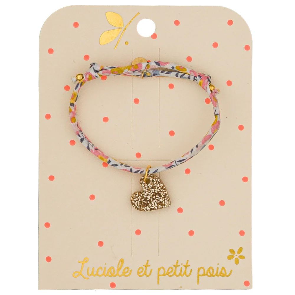 Le bracelet Liberty Wiltshire Bud Luciole et Petit Pois est un concentré de douceur et de fleurs. Avec son cordon Liberty délicat et son petit cœur doré, il ajoute une touche tendre et élégante aux poignets des enfants.
