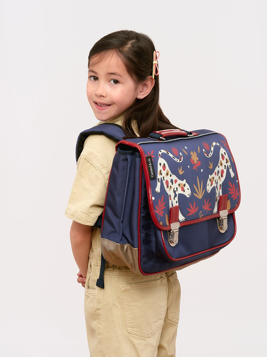 Ce cartable ergonomique Caramel & Cie Flower Panthers dispose de deux compartiments doublés, idéaux pour organiser livres et manuels scolaires selon les besoins. Un porte-étiquette pratique derrière le rabat permet de retrouver facilement son propriétaire en cas de perte. La grande poche avant, fermée par des scratches, est parfaite pour les crayons de couleur et le cahier de texte, avec un porte-clés intégré pour ne rien égarer. Le fond renforcé en simili cuir protège le contenu des chocs, tandis que les bretelles et le dos matelassés, recouverts de maille filet, assurent un confort optimal. La poignée ergonomique facilite le transport, offrant une praticité inégalée en toutes circonstances.
