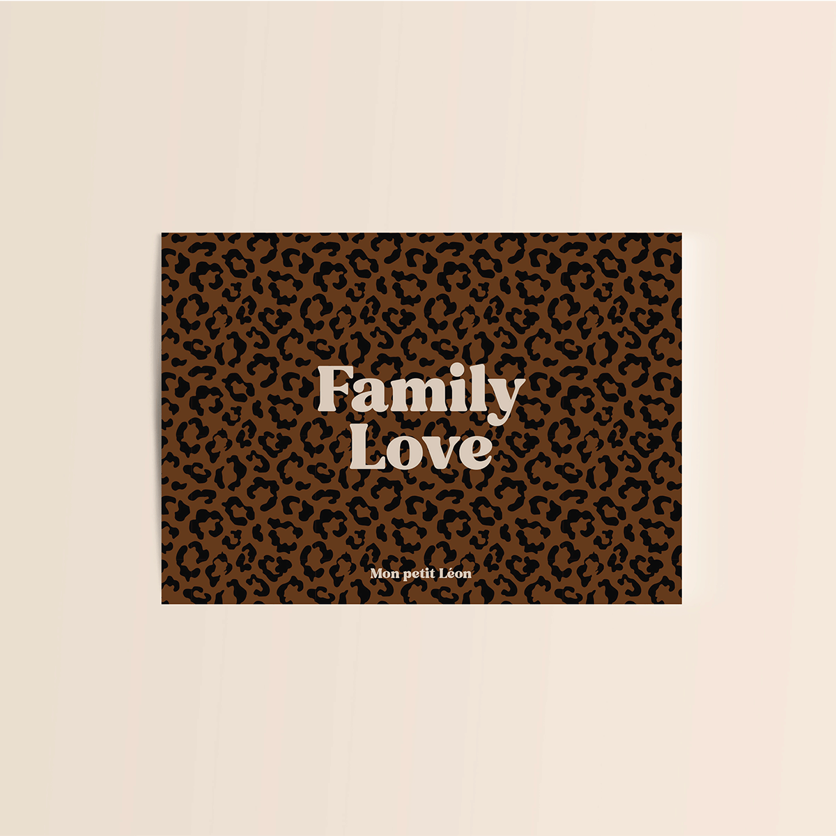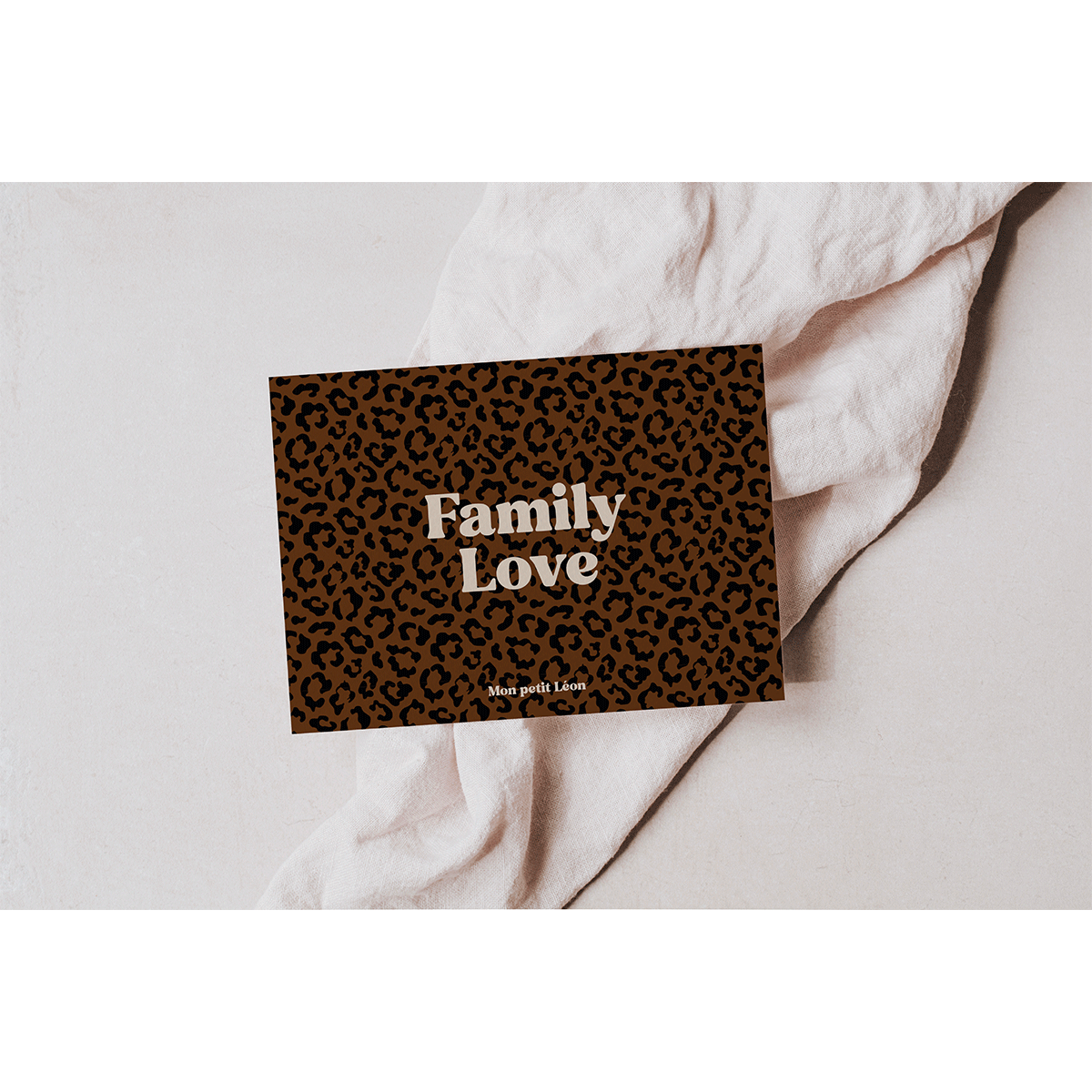 Au format A6, cette carte met en valeur le texte “Family Love” imprimé sur un fond léopard marron foncé, pour un rendu à la fois tendre et stylé.