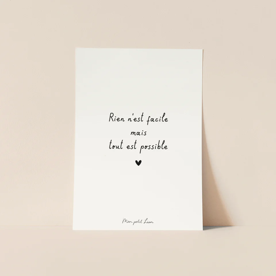 Avec la carte, le message “Rien n’est facile mais tout est possible” encourage à croire en ses projets et à avancer avec confiance.