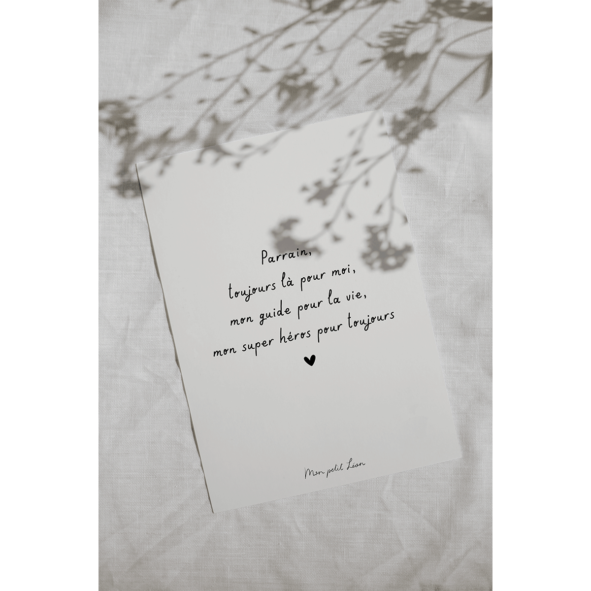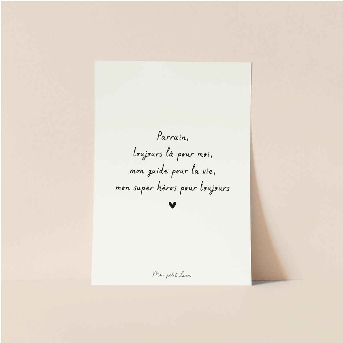 La carte citation Parrain A6 exprime tendresse et reconnaissance. Avec le message « Parrain, toujours là pour moi, mon guide pour la vie, mon super héros pour toujours », elle célèbre le lien unique entre un parrain et son filleul.