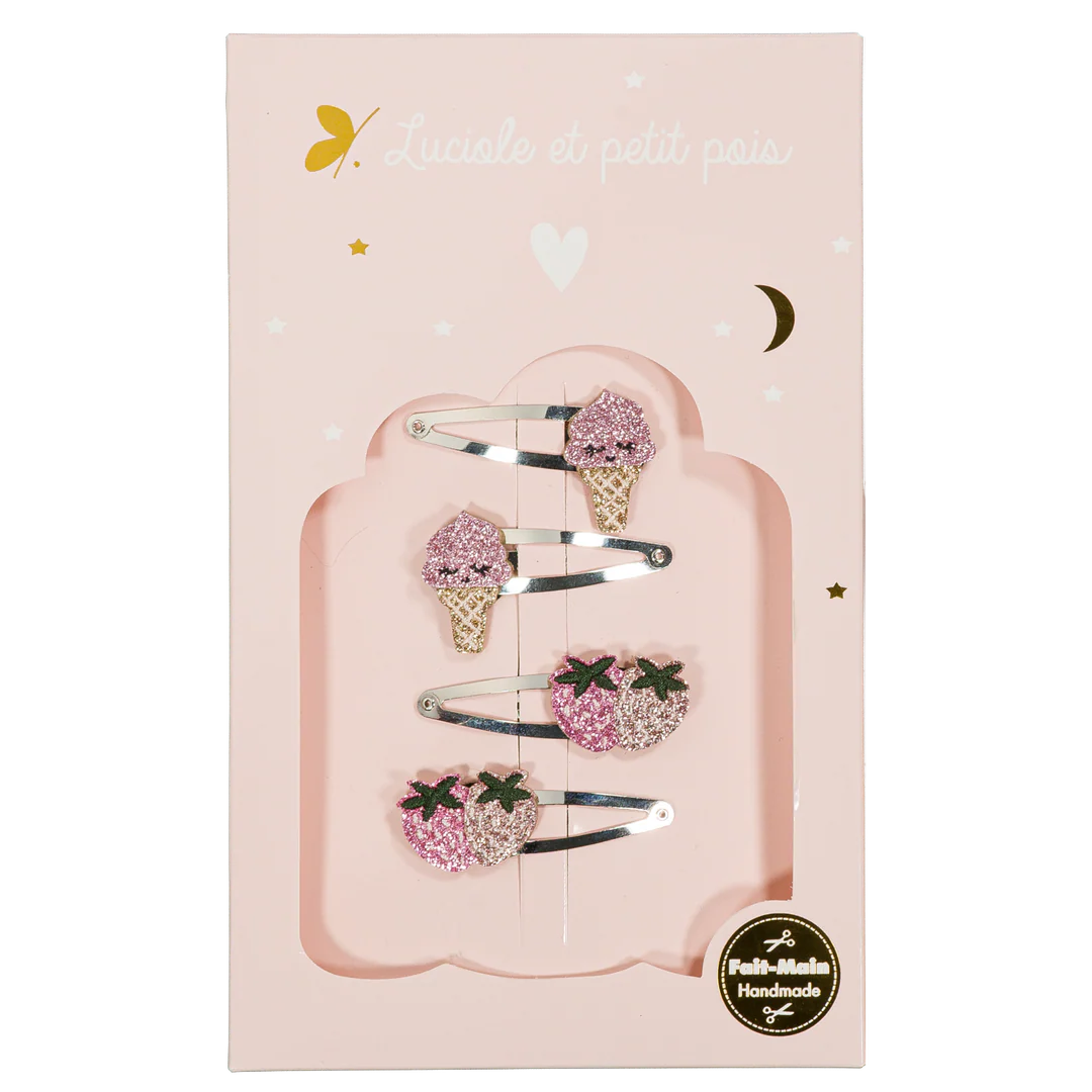 Le coffret Yummy barrettes Luciole et Petit Pois est un vrai concentré de gourmandise pour les cheveux. Avec ses barrettes fraises et glaces scintillantes, il apporte une touche sucrée et pétillante à toutes les coiffures.