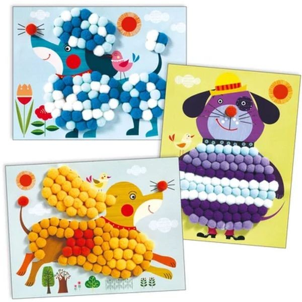 Le coffret collage pompons enfant Djeco plonge votre enfant dans une activité douce et amusante. Il décore trois chiens adorables avec des pompons colorés. Les zones à recouvrir sont déjà encollées, ce qui simplifie chaque étape. L’enfant colle, observe et complète son tableau sans frustration.