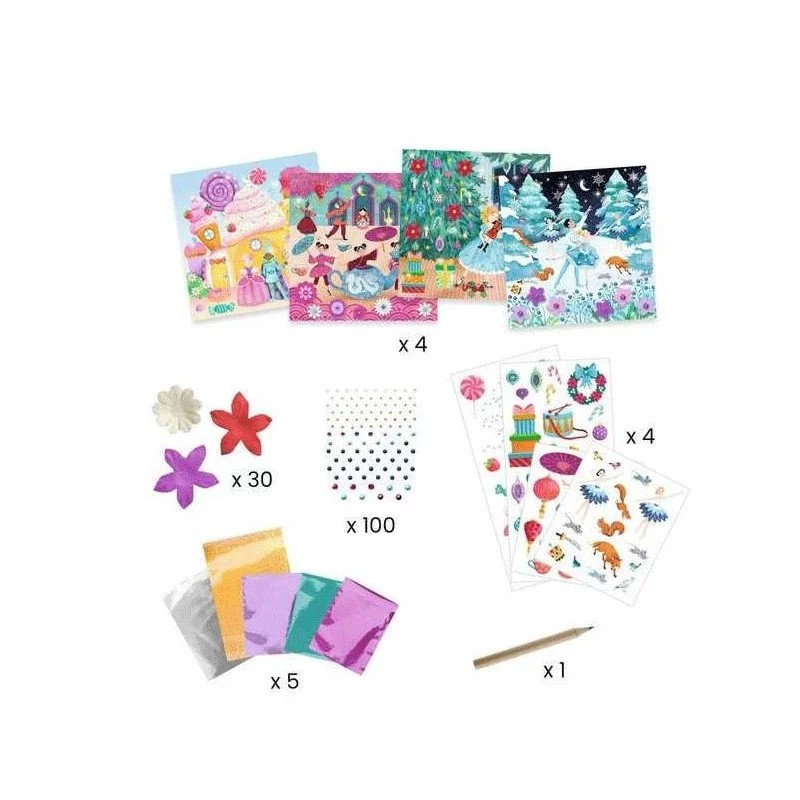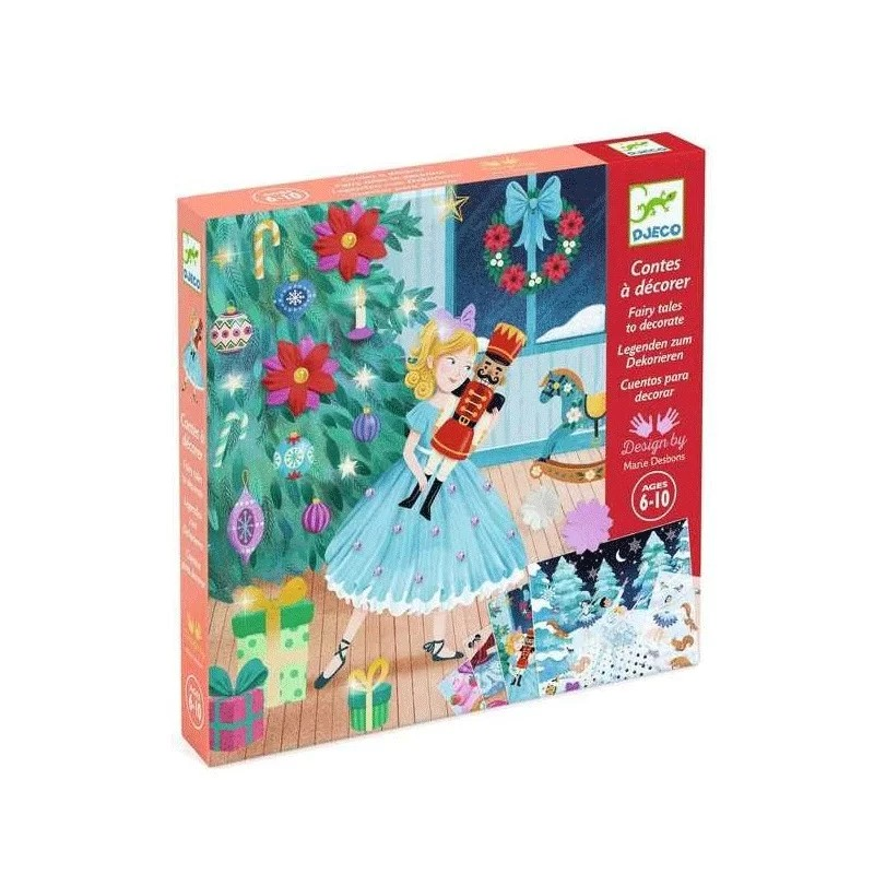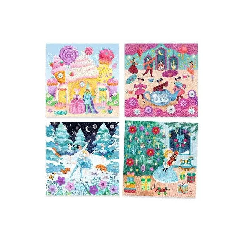 Le contes à décorer Casse-noisette de Djeco offre une expérience créative complète pour les enfants dès 6 ans. Chaque coffret permet de réaliser quatre illustrations inspirées des tableaux emblématiques du célèbre ballet : la veillée de Noël, la Valse des Flocons, les danses du Monde et le pas de deux au Palais de la Fée Dragée.