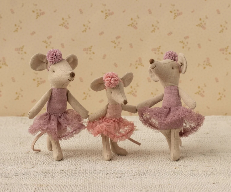 La danseuse ballerine souris Grande sœur de Maileg est prête pour des heures de danse. Elle porte un tutu couleur bruyère et un bandeau assorti.