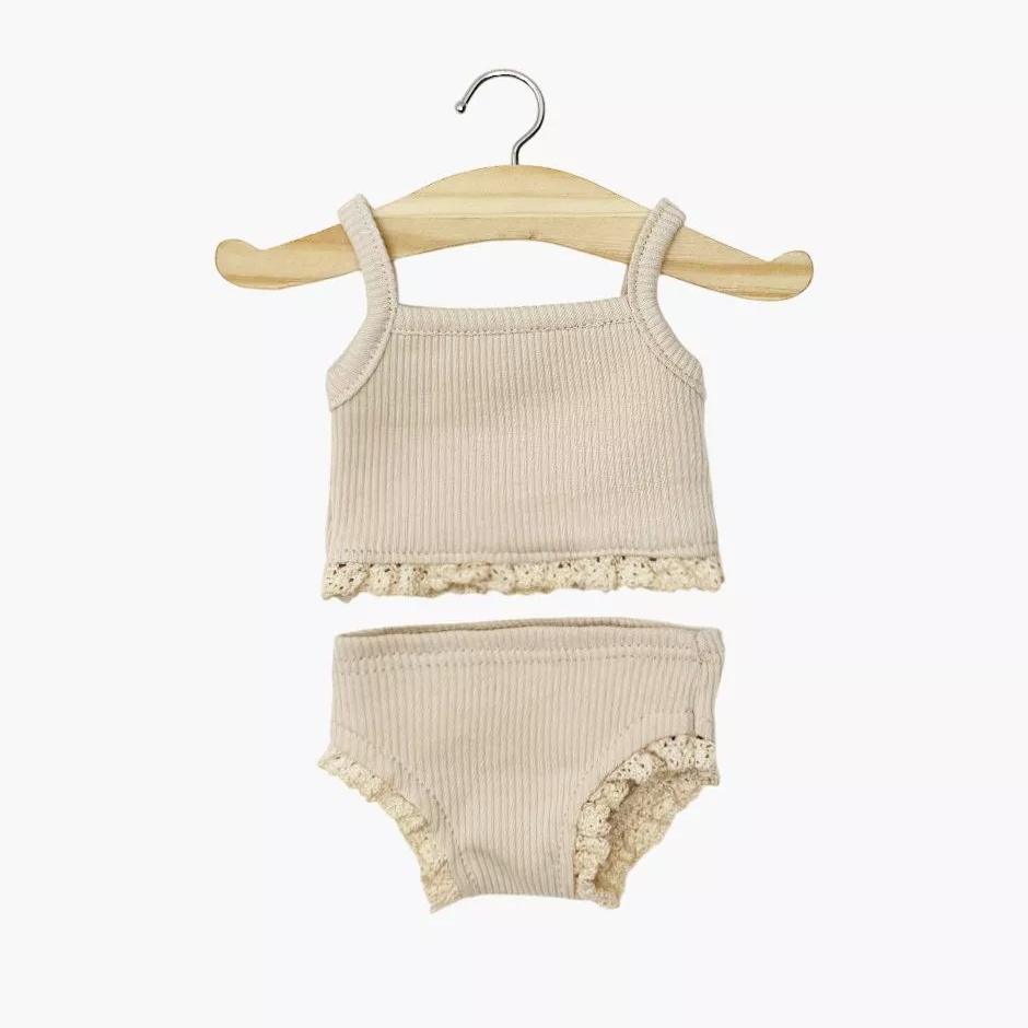 Le dessous fille Minikane en maille côtelée latte avec dentelle habille parfaitement les poupons Gordis de 34 et 37 cm. Sa finition délicate apporte élégance et charme aux poupées, pour un style raffiné et soigné.