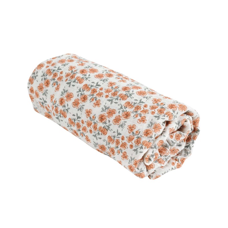 Le drap housse Bonjour Little imprimé Californian Poppy avec son motif de petits pavots de couleur ocre, inspiré des vastes étendues couvertes de ces fleurs près des forêts de séquoias en Californie.