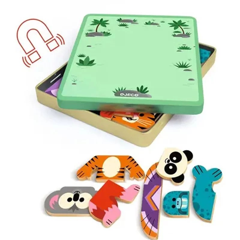 Le jeu éducatif bois Inzebox Mix’n’Match de Djeco permet aux enfants de créer et mélanger des animaux avec des magnets en bois. Ils posent les magnets sur la boîte métallique et suivent les modèles ou inventent leurs propres combinaisons.