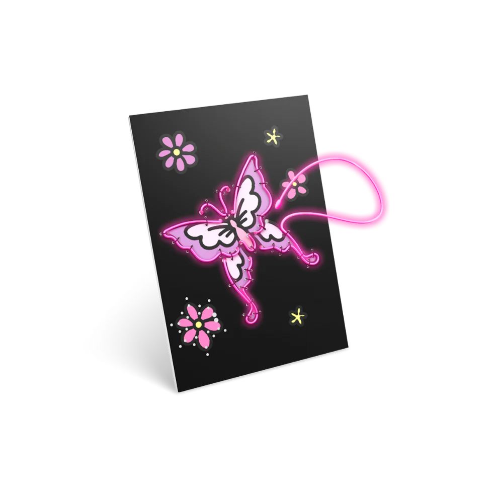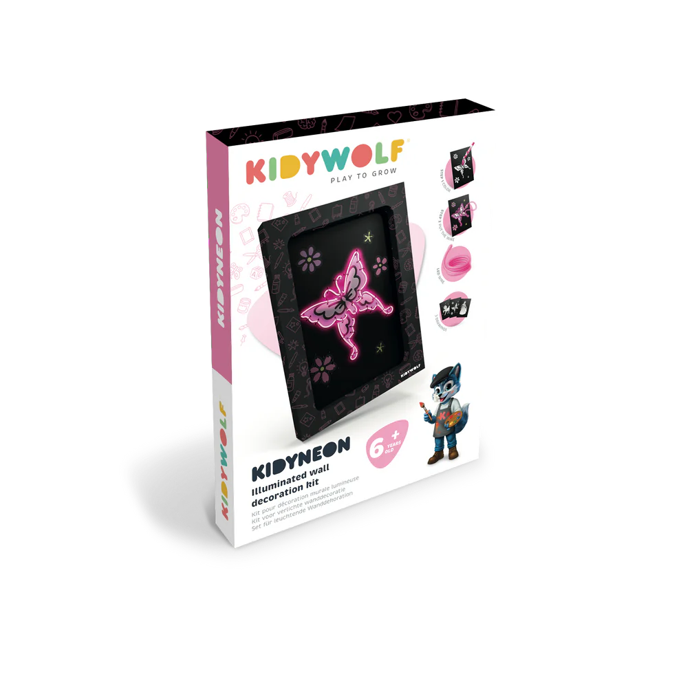 Le kit décoration lumineuse Contes Kidyneon de Kidywolf transforme les loisirs créatifs en aventure lumineuse. Les enfants insèrent le fil néon dans une planche pré-perforée pour créer des tableaux lumineux inspirés des contes.