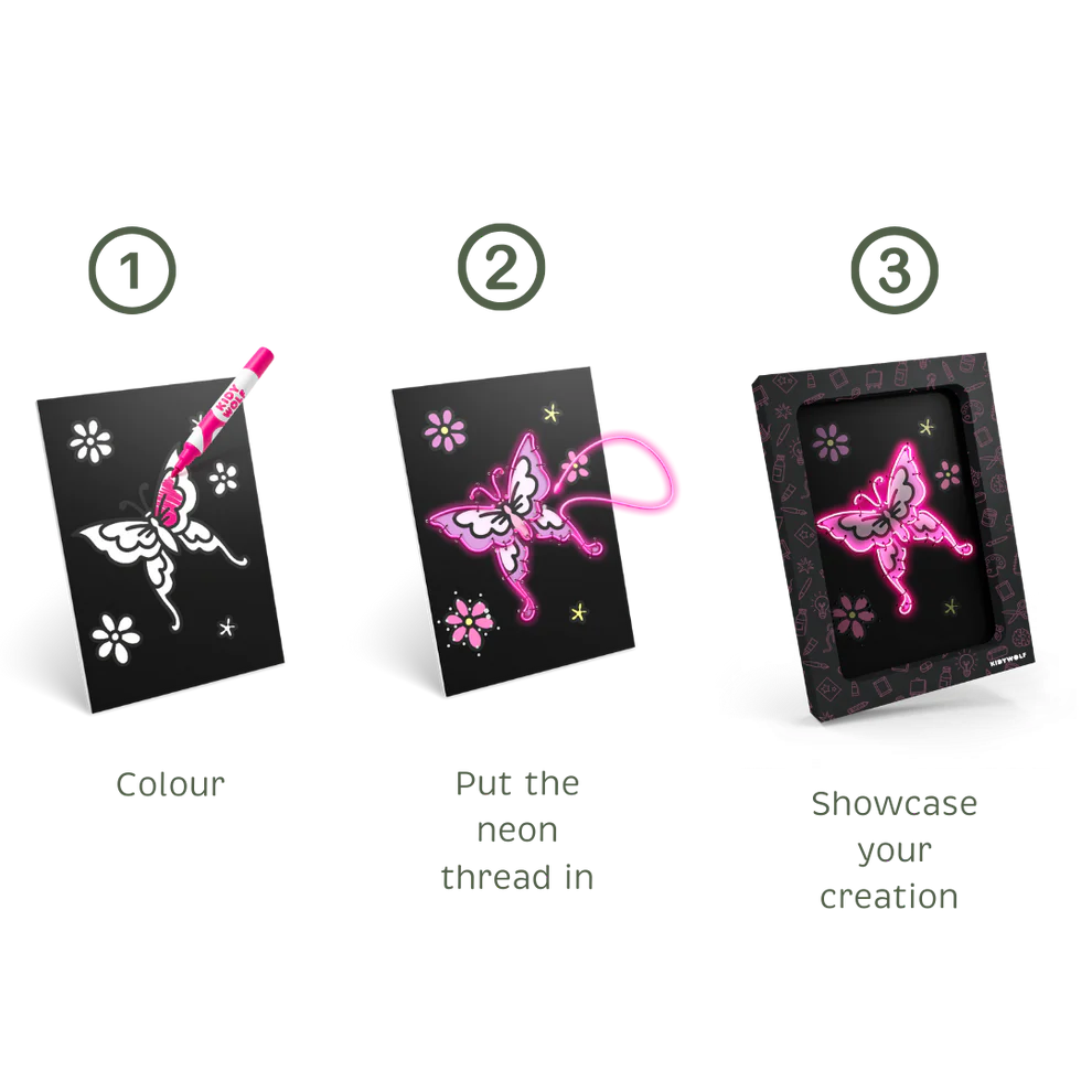 La boîte se transforme en cadre, et aucune colle ni ciseaux ne sont nécessaires. Les enfants manipulent facilement le fil néon, ce qui favorise concentration et précision tout en stimulant leur imagination.