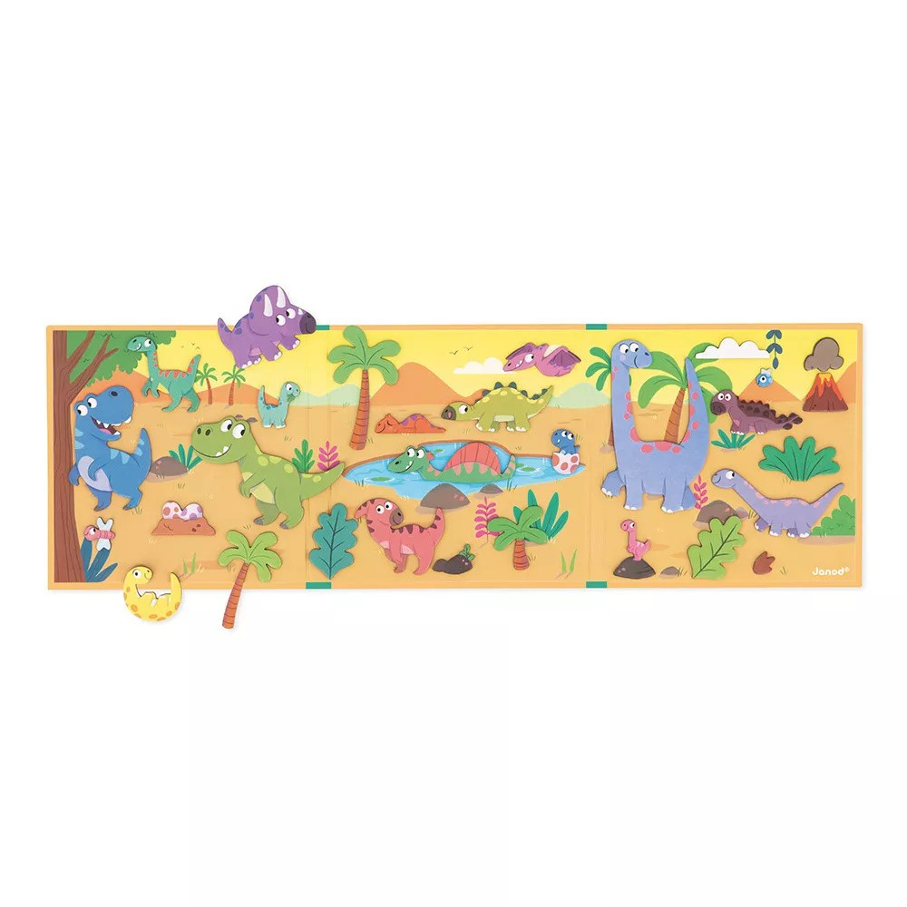 Ce jeu magnétique comprend un décor illustré représentant un paysage préhistorique, accompagné de 30 magnets colorés sur le thème des dinosaures. Votre enfant pourra créer ses propres scénarios en plaçant les dinosaures et les éléments du paysage selon son imagination.