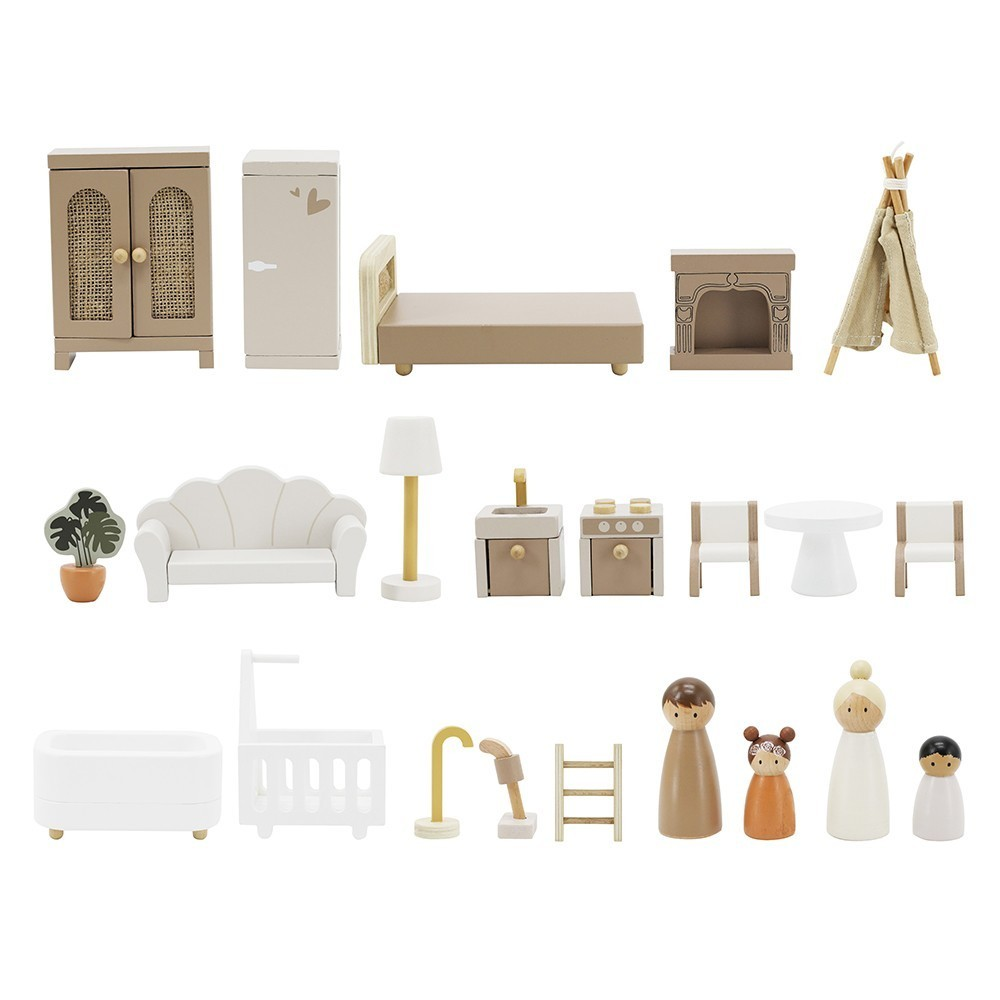 Le set comprend tous les accessoires essentiels : lit, armoire, canapé, cuisine, table, chaises, baignoire, aspirateur et bien plus. Une famille de poupées en bois complète la maison pour inventer des scènes réalistes.