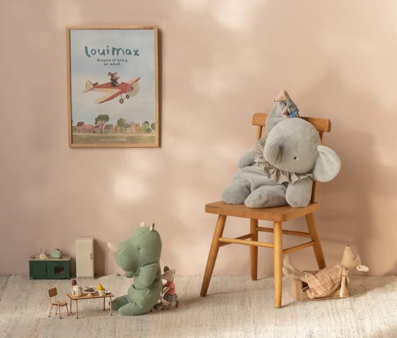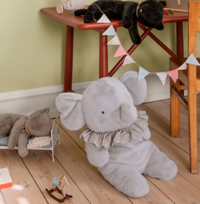 Une peluche éléphant Maileg douce et réconfortante, parfaite pour câlins, jeux et décoration dans la chambre des enfants.