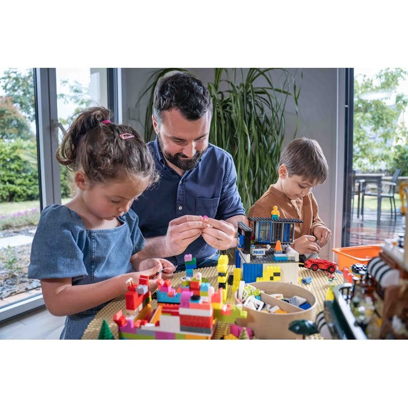 Les picots du plateau sont compatibles avec les briques standards, notamment les briques type LEGO®. Les constructions tiennent bien en place. Cela permet de créer des projets simples ou plus ambitieux, sans risque de chute. Le plateau aide aussi à développer la motricité fine, la logique et la coordination.