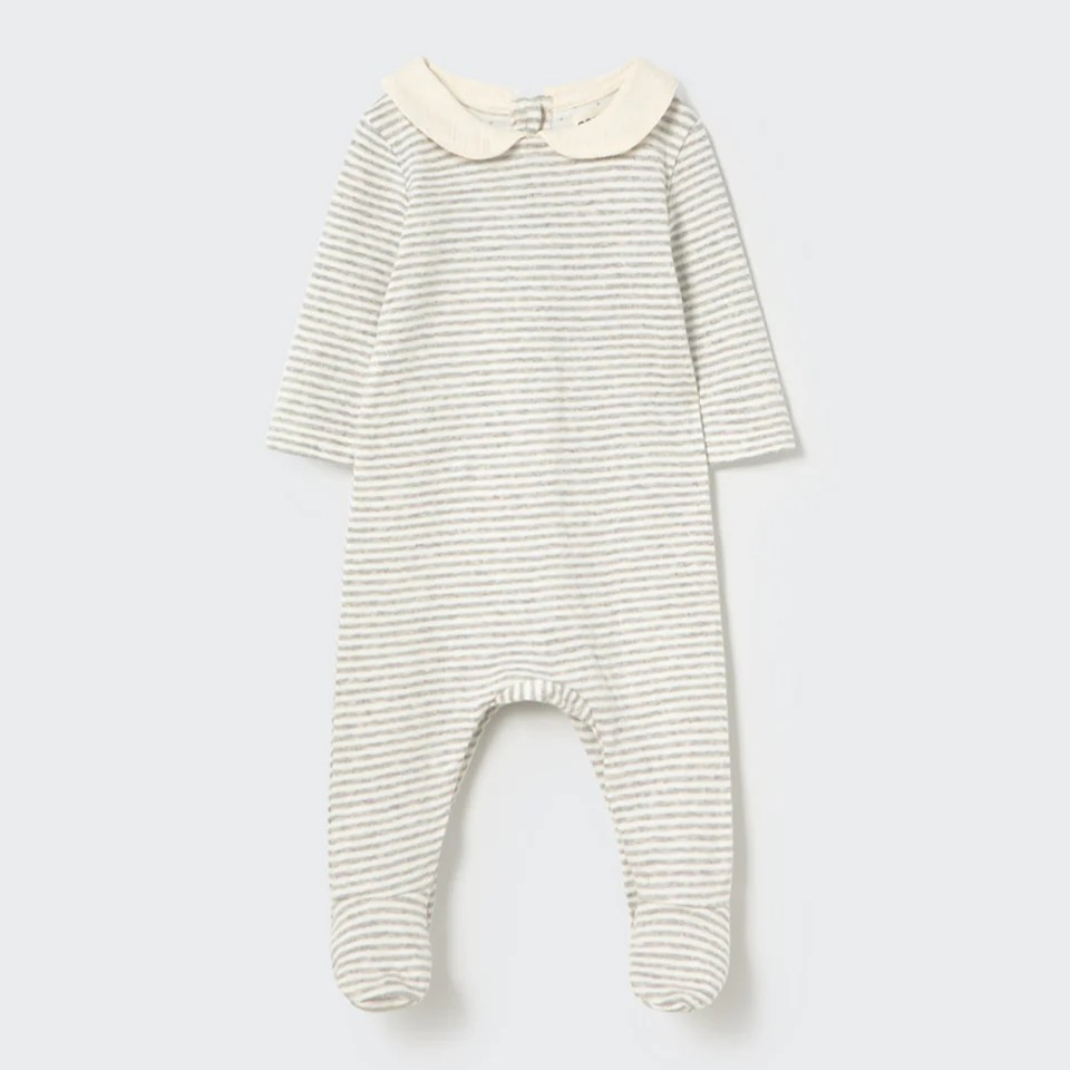 Ce pyjama rayé possède un col Peter Pan uni, des manches longues et des pieds intégrés pour garder bébé bien au chaud. Les pressions au dos et sur les jambes facilitent l’habillage et le change. Sa maille respirante permet à bébé de rester confortable sans surchauffe.