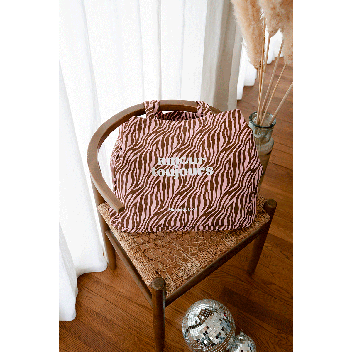 Alliez style et praticité avec le sac cabas zèbre rose Amour Toujours. Conçu en toile de coton ultra-résistante, il est l’allié parfait de toutes vos journées bien remplies : plage, shopping, escapade du week-end ou même travail.