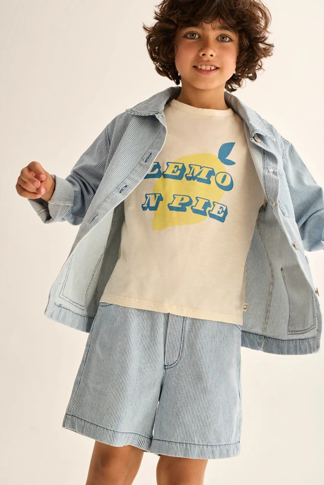 Le short denim rayé Cedar de Cozmo est parfait pour un look estival stylé et confortable. Leur motif à fines rayures apporte une touche moderne, tandis que la coupe Bermuda assure une aisance maximale pour jouer et courir.