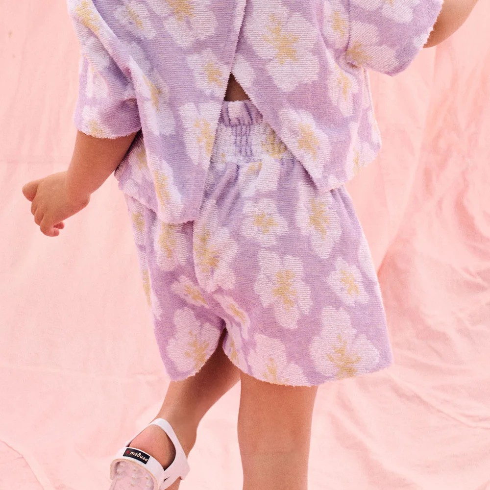 Un short fille éponge lilac confortable et tendance, idéal pour profiter de l’été en toute liberté.
