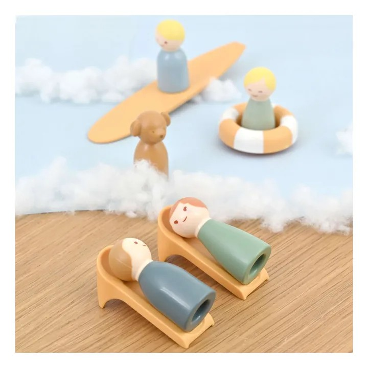 Plusieurs accessoires complètent le jeu. Deux transats permettent de se détendre. Une planche de surf et une bouée offrent encore plus d’aventures. Le Combi peut même se transformer en bateau pour multiplier les histoires.
